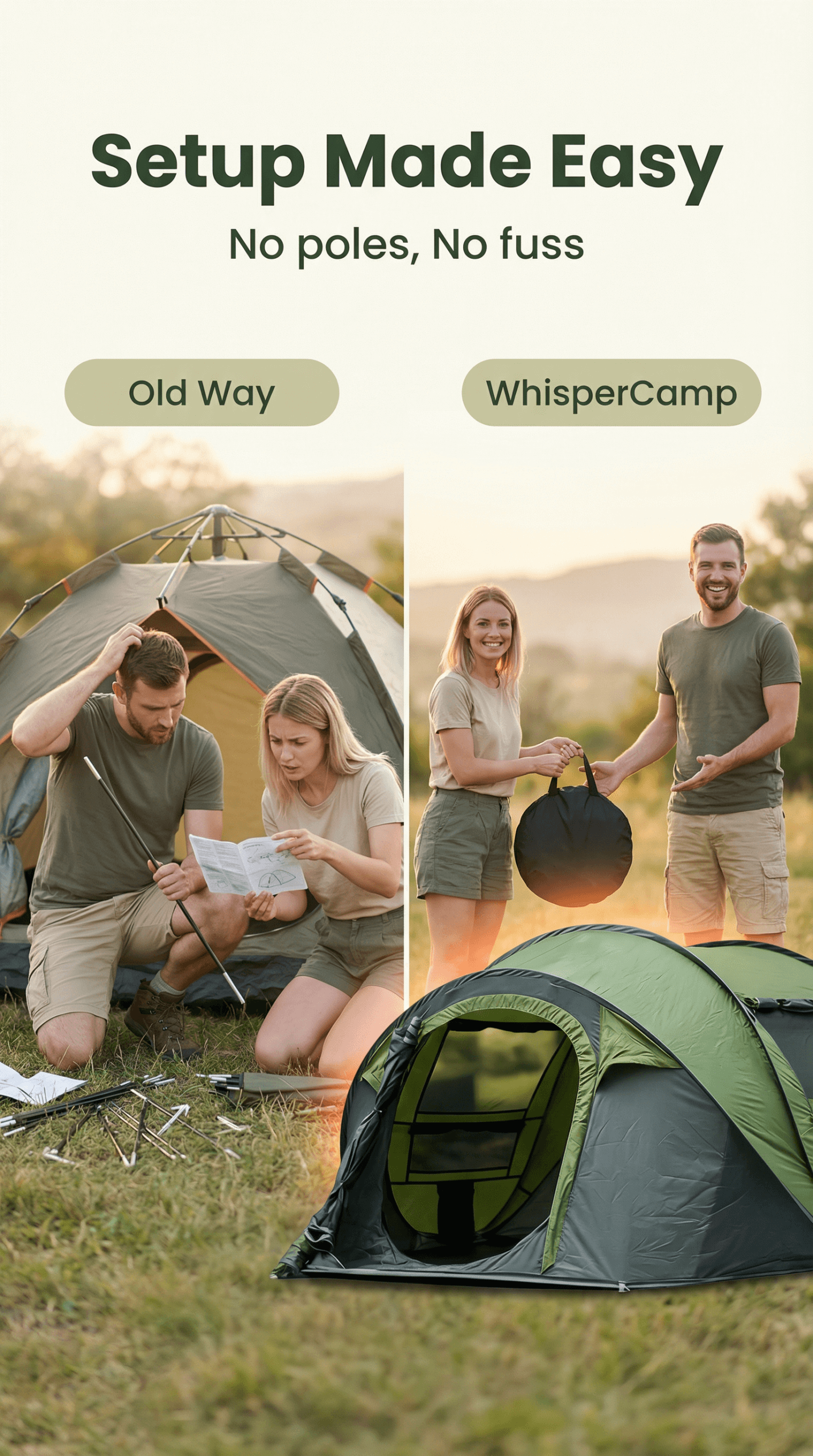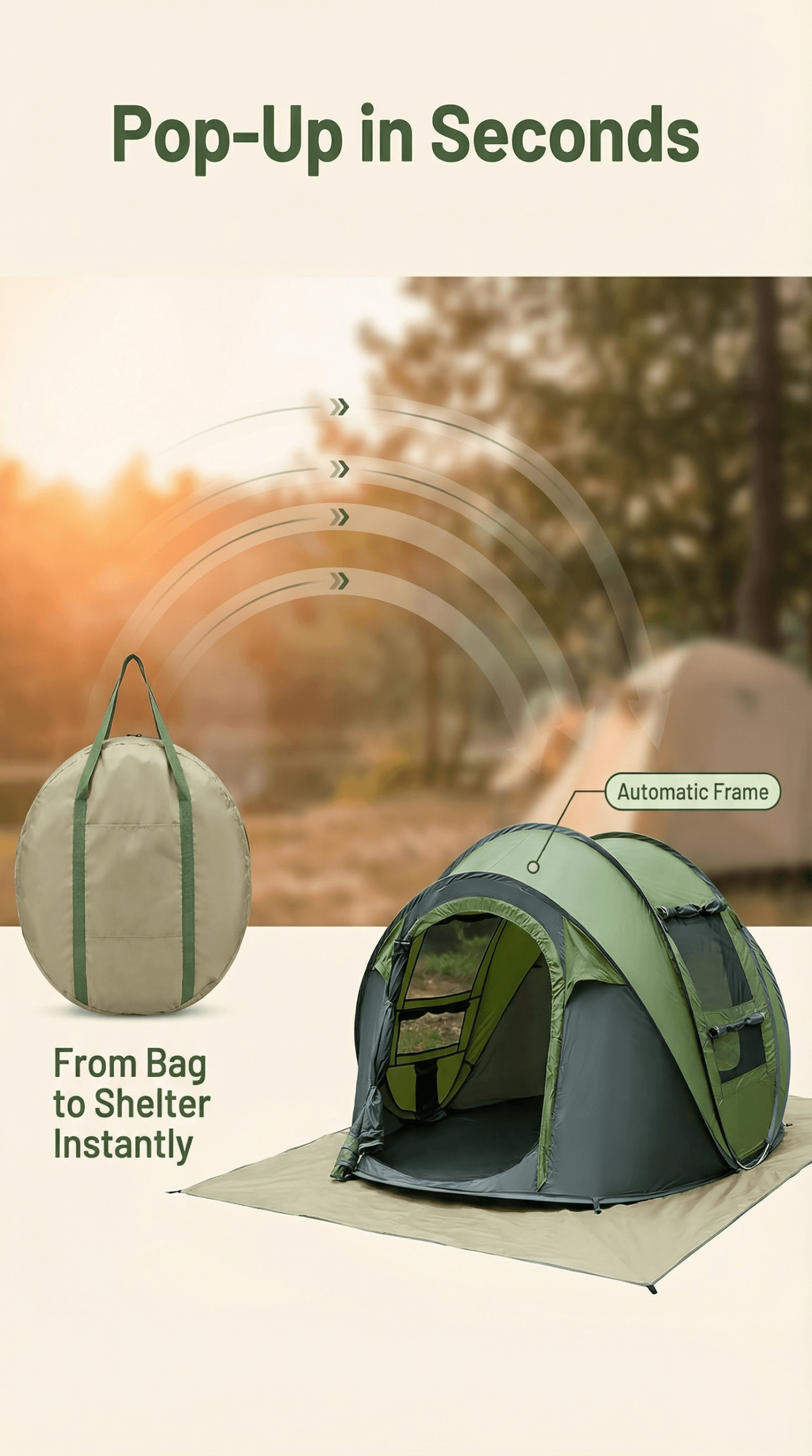 Instant Setup in Seconds: Unfold it, and the tent pops up into place automatically. No poles, no hassle.